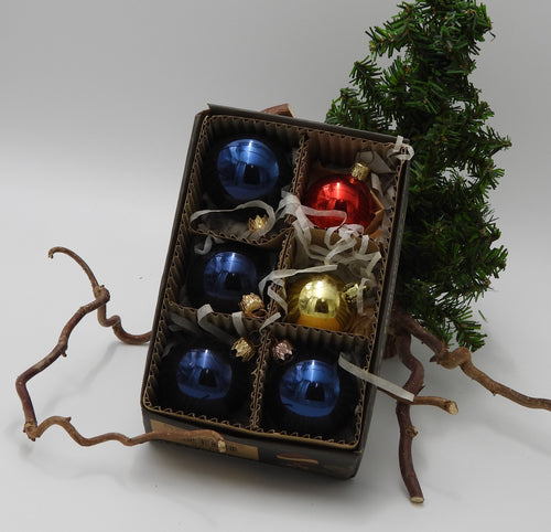 6 julekugler blå rød og guld