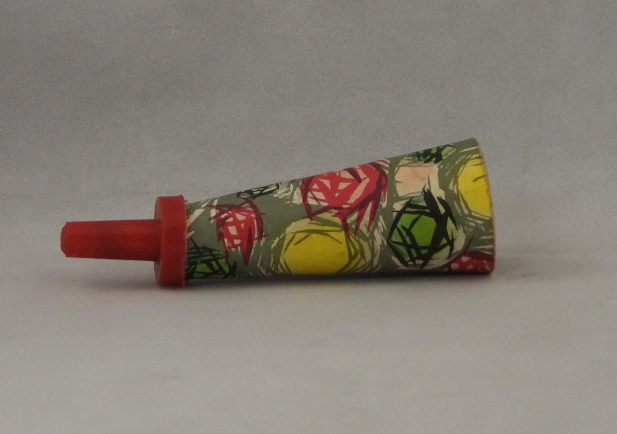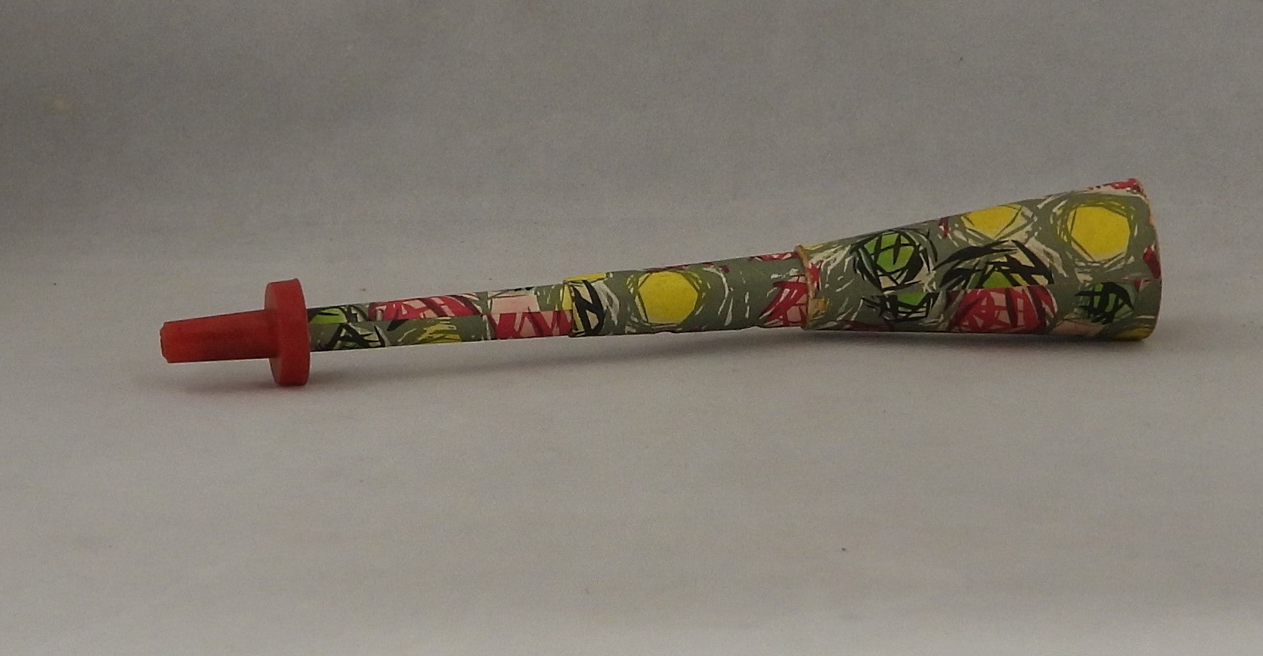 Ældre truthorn der kan lukkes sammen. Måler 17 cm når det er trukke ud. Lavet af pap og plastik