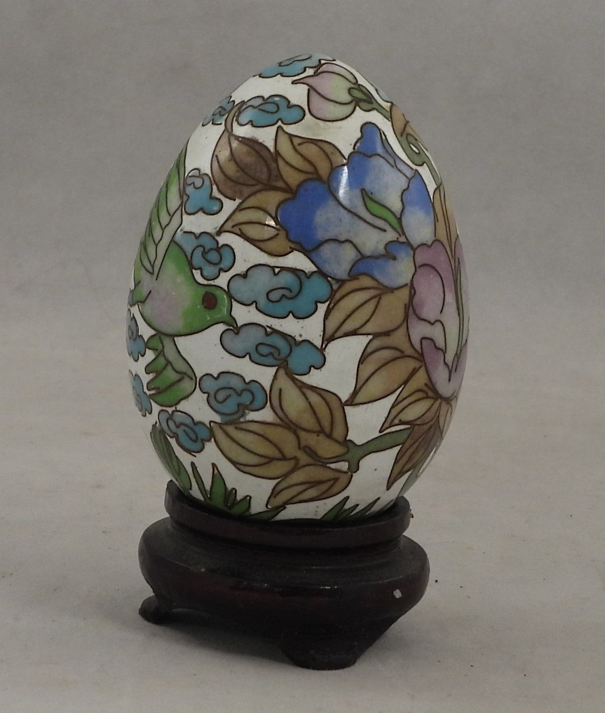 Cloisonne æg lille 5 cm med hvid bundfarve og lilla blomster