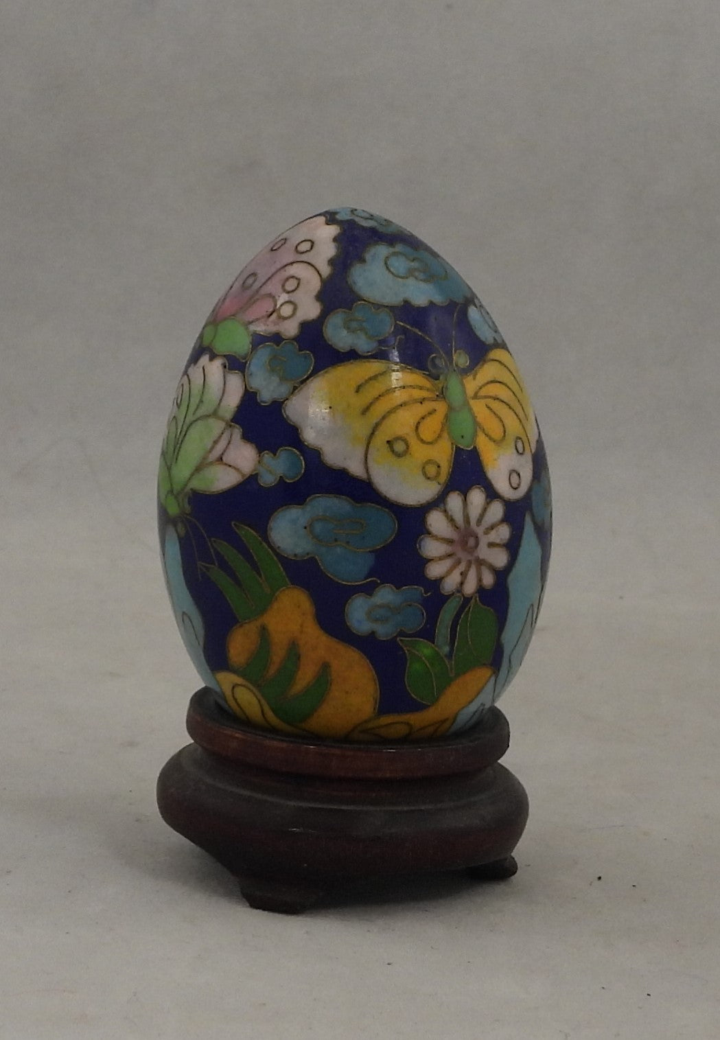 Cloisonne æg 6,2 cm med blå bundfarve og gul sommerfugl
