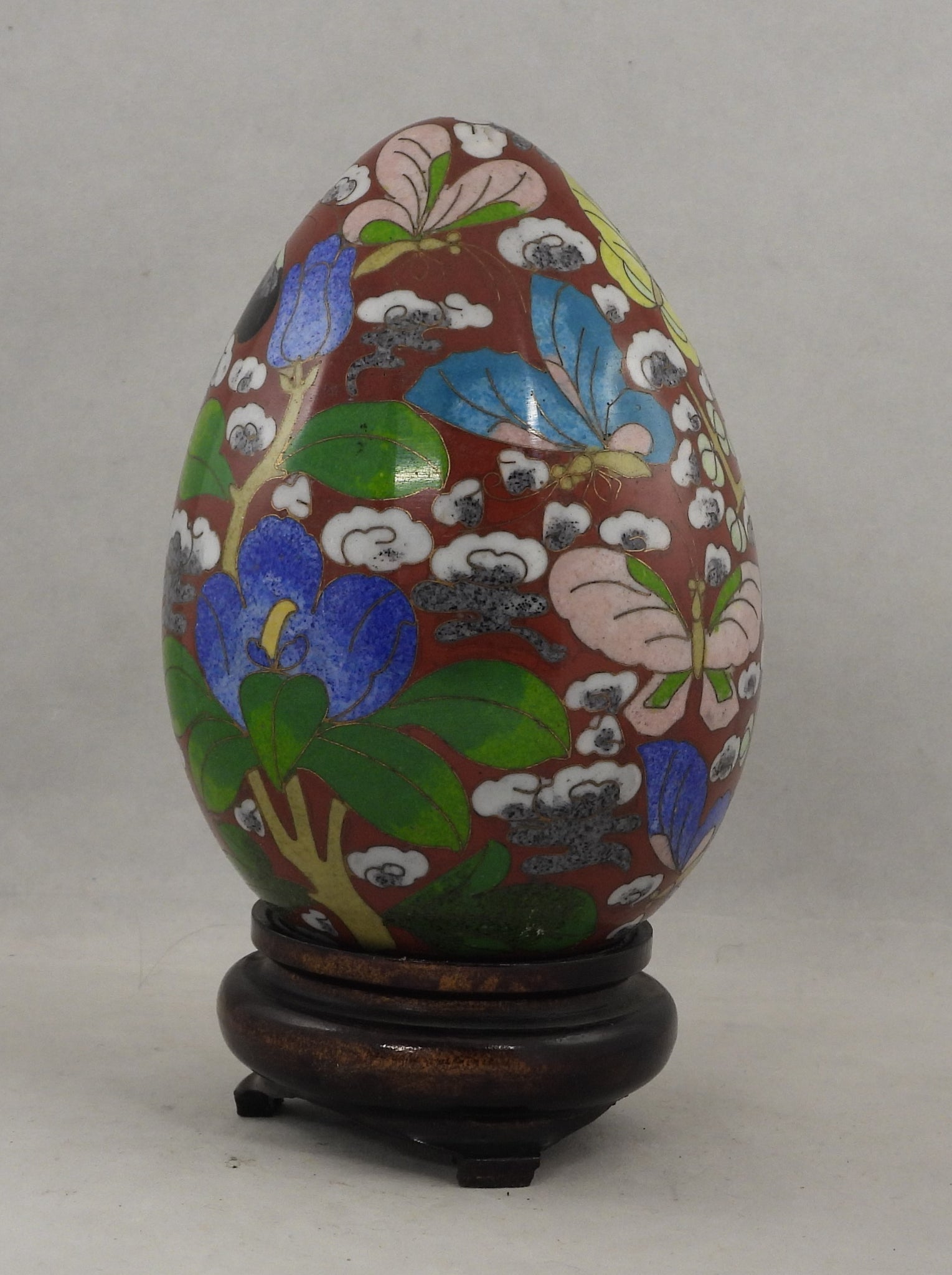 Cloisonne æg 13,8 cm højt med bordeaux bundfarve og blå blomster