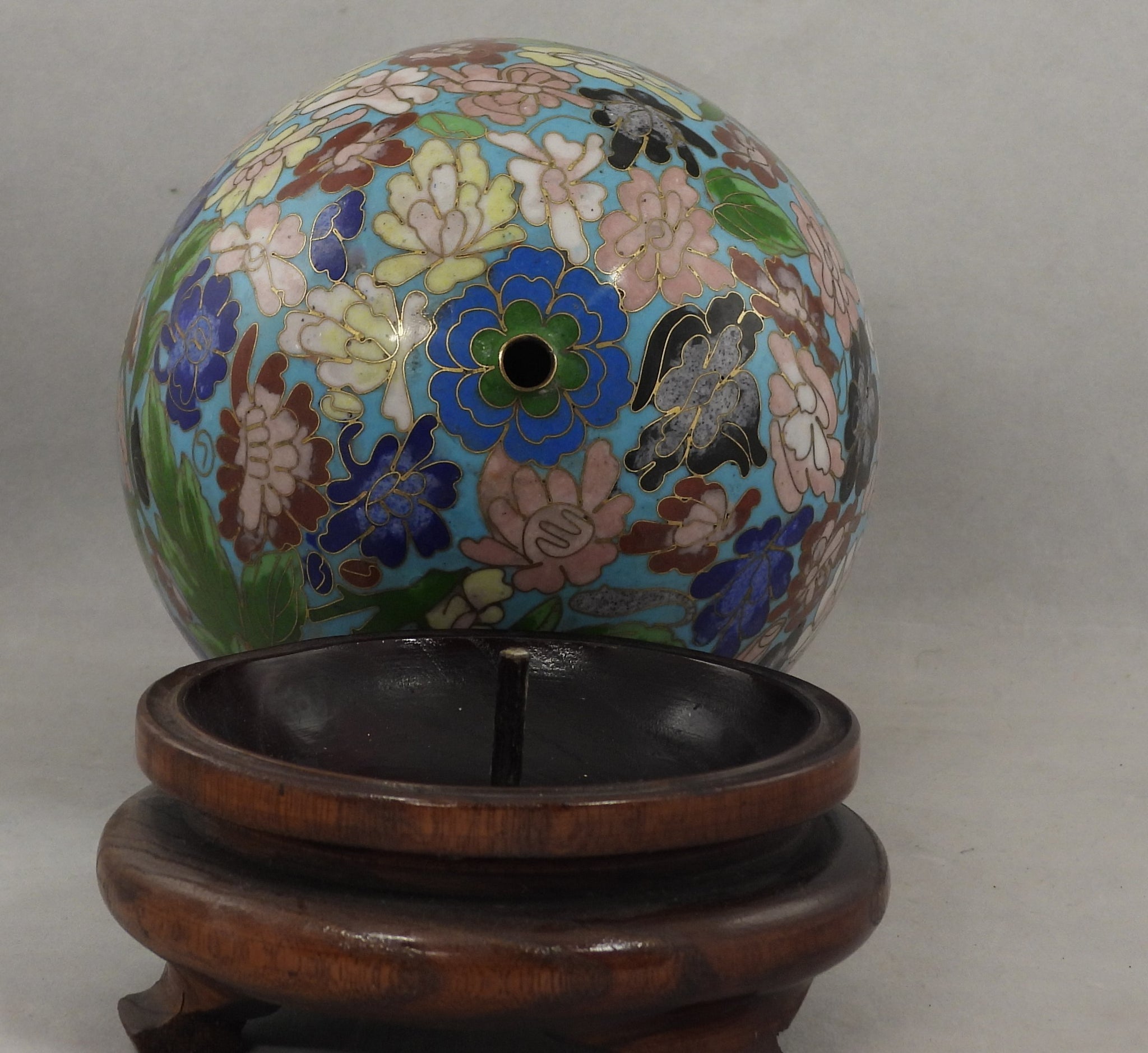 Cloisonne æg 16 cm højt med blå bundfarve orange gule og blå blomster