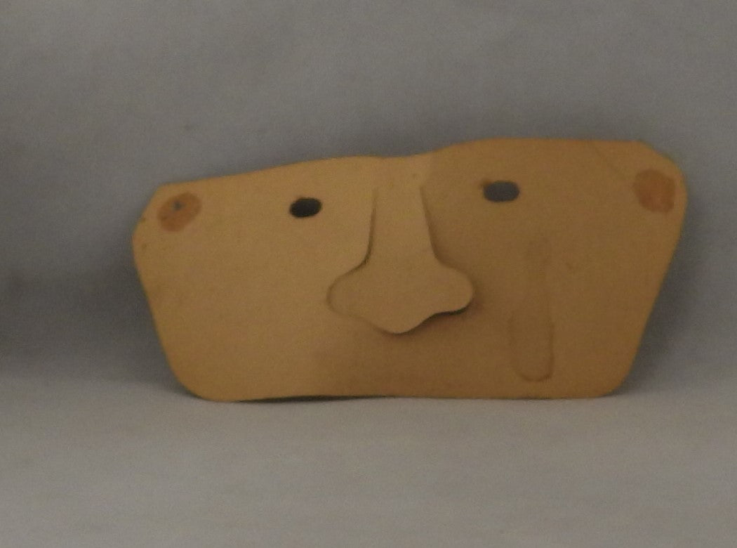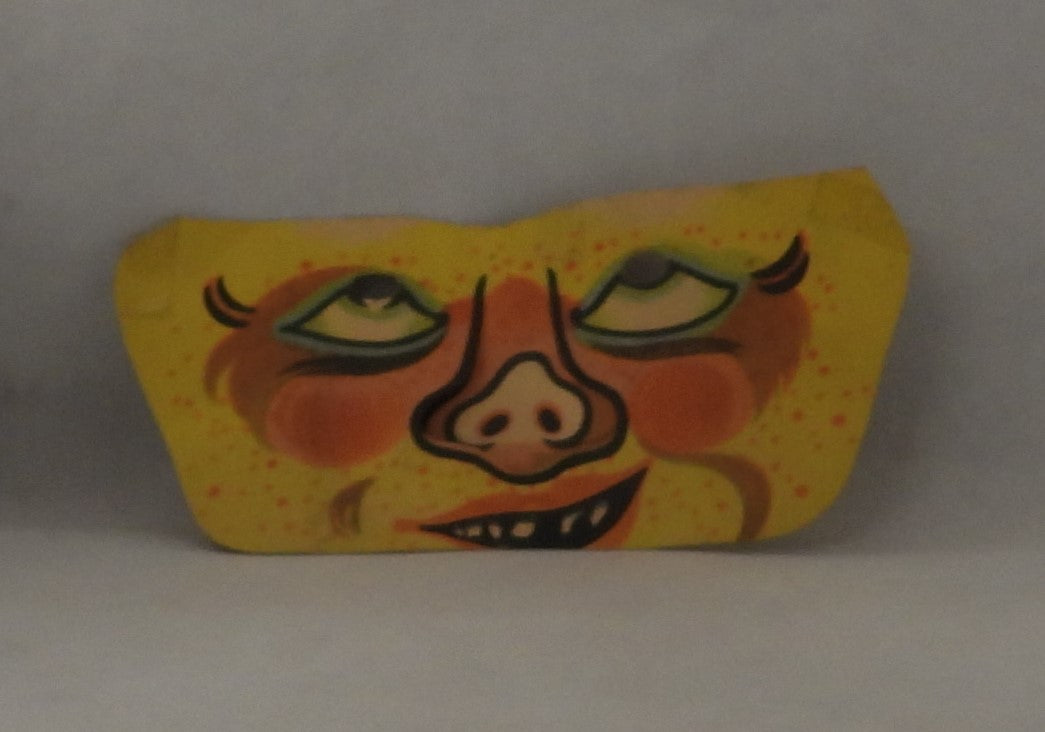Gammel halvmaske af pap med skæve tænder. Der er noget klisterbånd på så den har hængt til pynt i butikken. Måler 21 cm i bredden 9 cm i højden